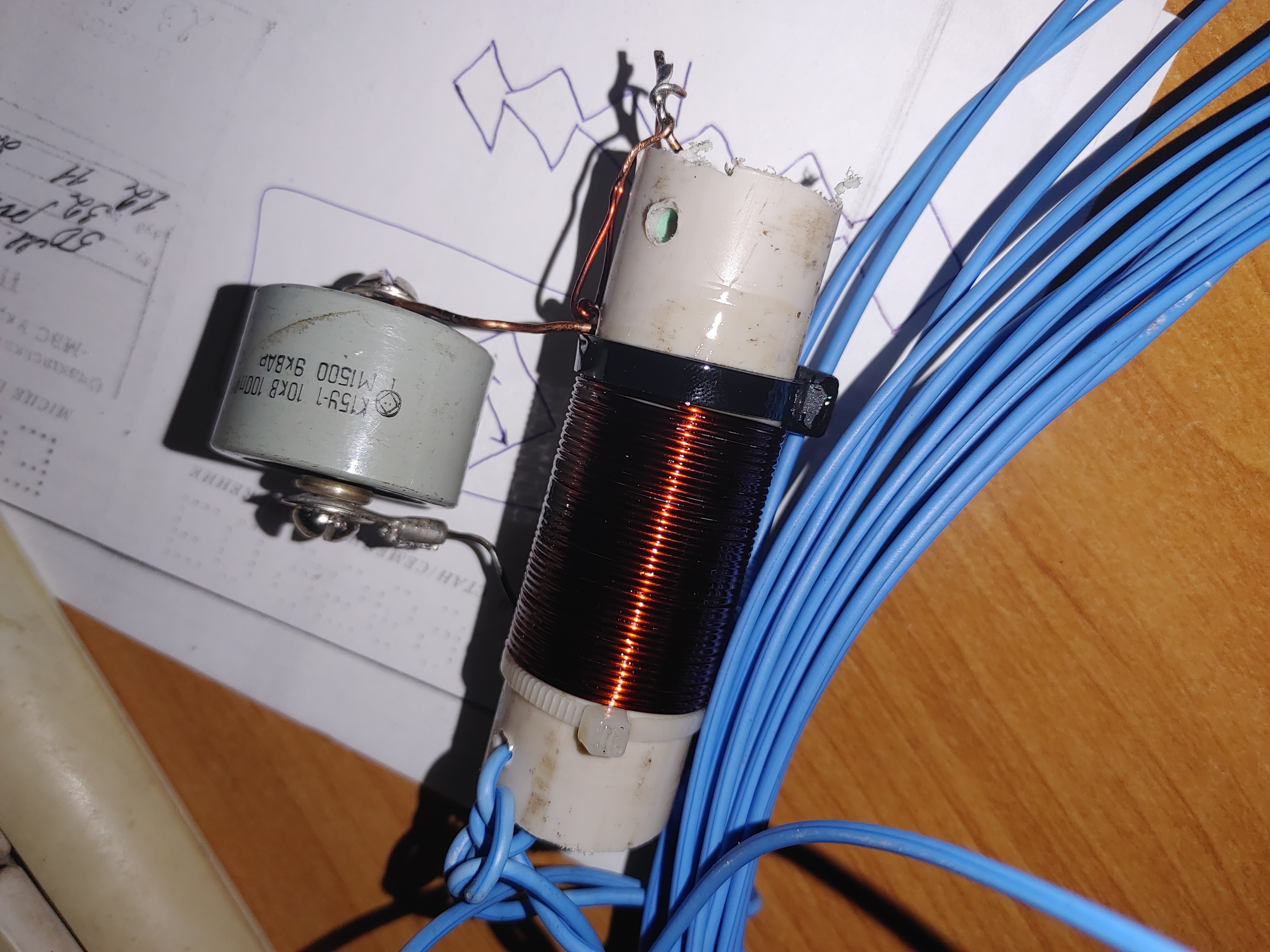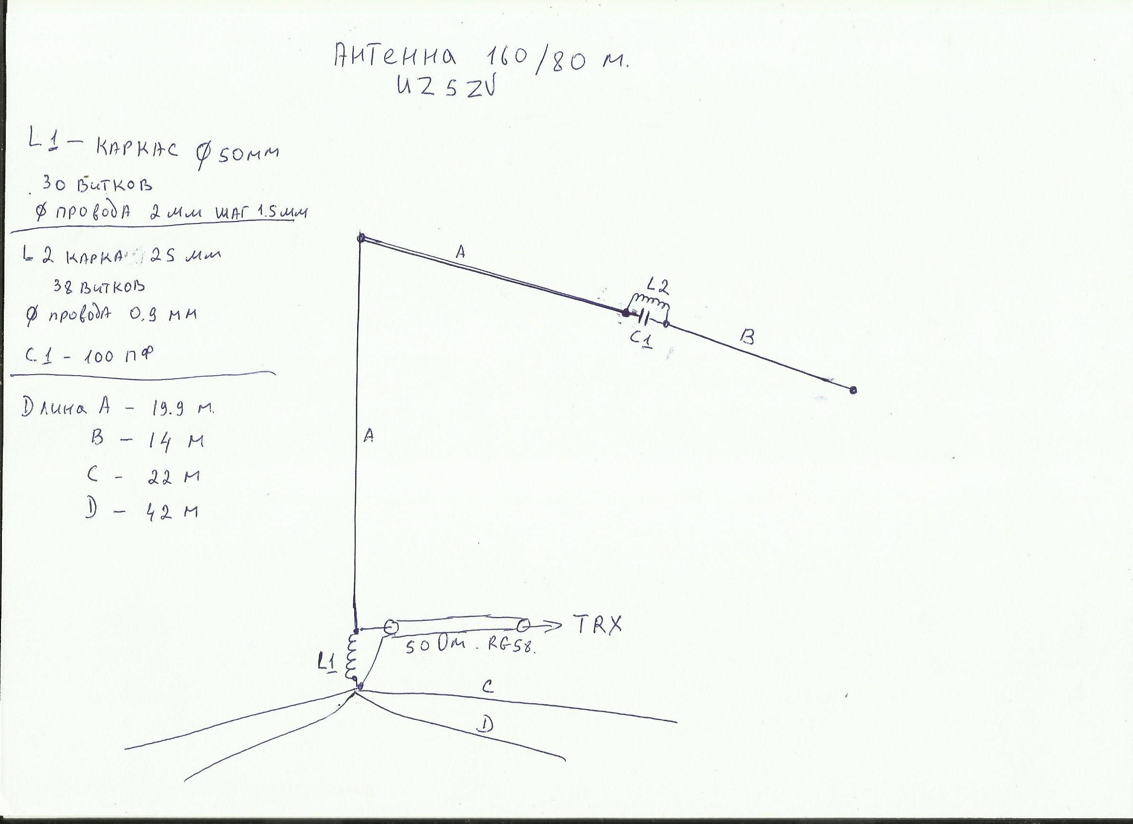 материал полотна расплетенный полевик из двух кусков А и В. в роли мачты используется дерево плюс прикрученный к вертикальной ветке кусок рейки длиной около 4 метров , на конец рейки прикручен изолятор (орешек) через который пропущено полотно, получилась высота около 12метров.. В низу под деревом согласующее устройство (назовем его так) от демонтированной антенны dl2kq. Данные трапа взят из статьи удлиненная W3DZZ, 160\80\40м. сторону полотна В крепить как можно выше. на 40 метров не пробовал